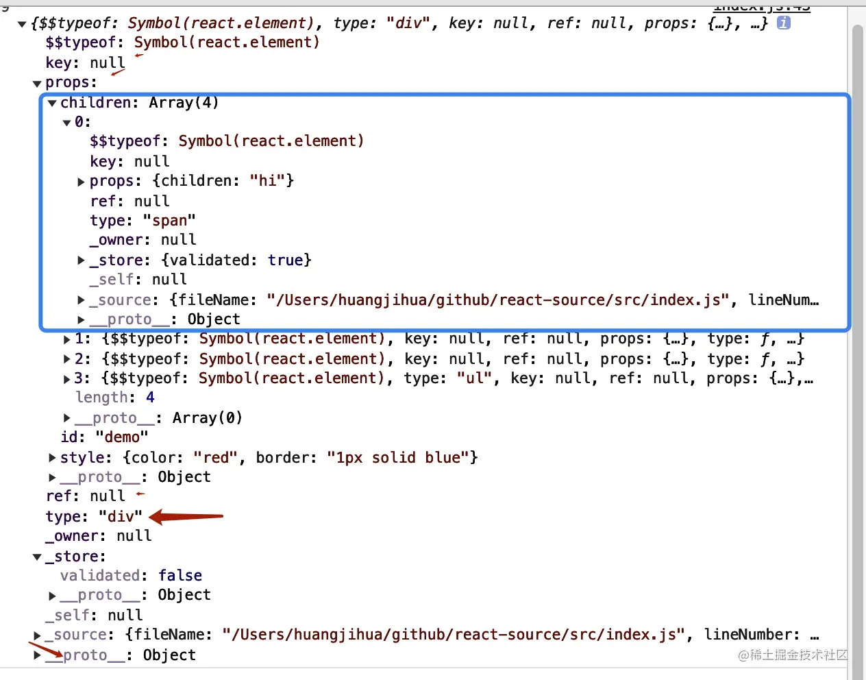 key好比是渲染列表的时候传的唯一值,主要作用是为了提高在diff过程的效率;props属性里既包含当前元素属性又包含子元素(children),仔细观察children元素数据结构与其父元素是一样的;ref用于引用DOM;type就更有用了,可以直接标明当前标签的类型是什么;