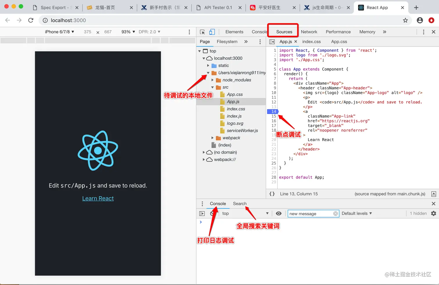 React调试JS代码与调试ReactNative基本一致。主要有以下几种调试方式: