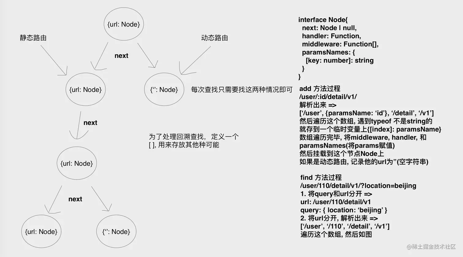 我看了一些陆游的处理, 如koa-router的实现, 使用的path-to-regexp这个库. 使用正则方式优点就是提供的特性非常全, 很方便. 但是我认为用正则并不是解决路由的最好方法. 所以我与其他服务一样, 使用的Trie树(前缀树). 这位大佬写的关于Trie树就挺好的. 我总结了一张图, 基本能代表我处理路由的实现. - 装饰器