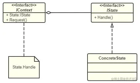 - ConcreteState(具体状态角色),每一个具体状态必须完成两个职责:就是本状态下要做的事情,以及本状态如何过渡到其他状态。