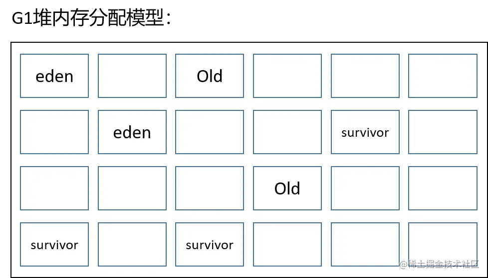JDK1.7正式使用,且使用了全新的算法,看起来有取代CMS的趋势。G1保留了分代的概念,但是从堆结构上看,分代内存并不是连续的。如图: