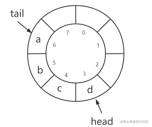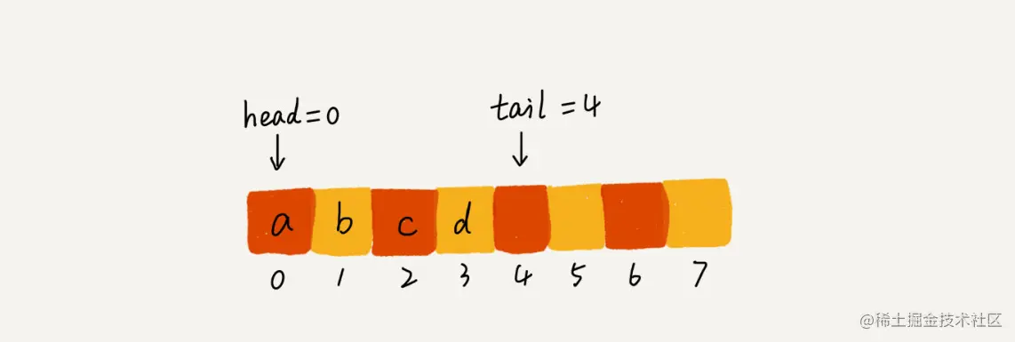 如图所示,当[a, b, c, d]依次入队之后,队列中的 head 指针指向 0 位置(head = 0),tail 指针指向 4 位置(tail = 4)。