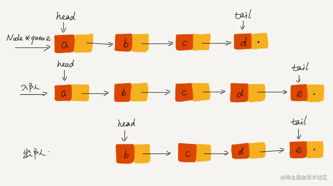 基于链表的实现,我们同样需要连个指针:head和tail。它们分别指向链表的第一个结点和最后一个结点。如图所示:入队时,tail.next = new Node(); tail = tail.next;出队时,head = head.next;。