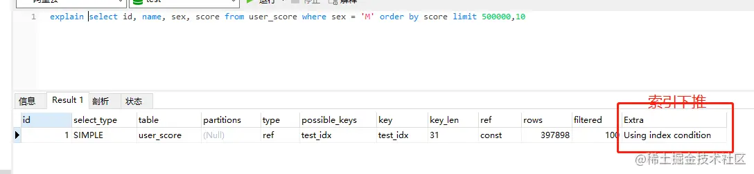 根据key:test_idx,extra:Using index condition 我们可以得知,查询利用索引test_key检索出了sex=M的