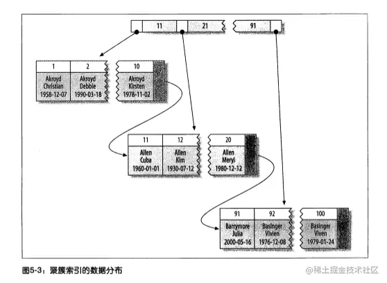 以InnoDB的聚簇索引来说明:以主键列建立索引,并在叶子节点上储存了全部的数据行。