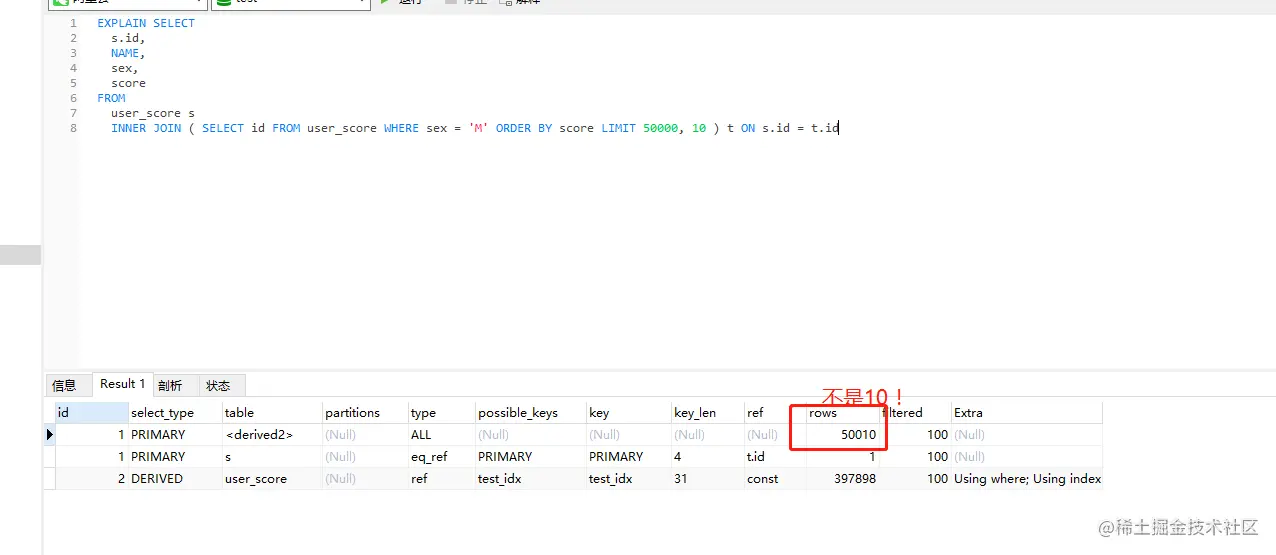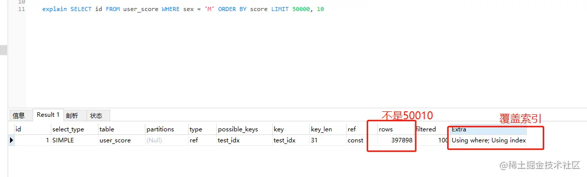表 user_score(id, sex, name, score) 索引test_index(sex, score)