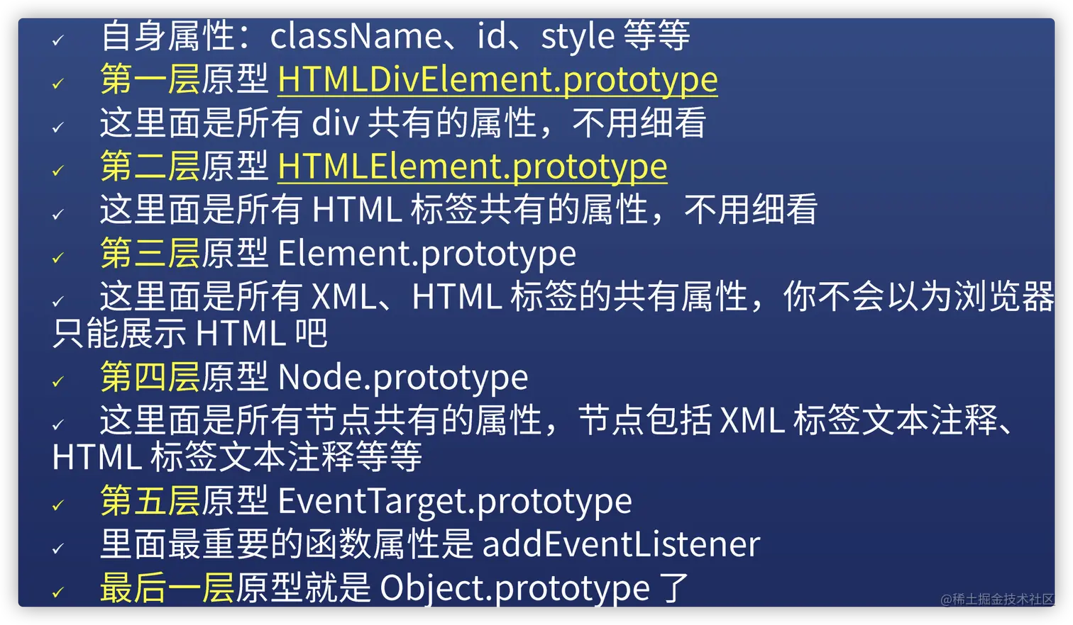 我们可以得出一个元素对象的原型链,一共分为六层,每一层都为元素对象提供原型方法。