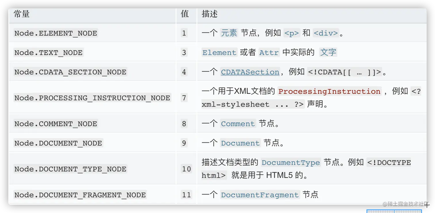 元素实际上就是节点里面的子节点,节点包括元素、文本、注释等,通过node.nodeType能获得节点类型,返回的数字是通过以下图来分辨类型的