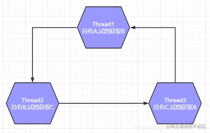 如下图所示, 三个线程死锁的环路. 除非拿到了想要的锁, 才会释放资源.