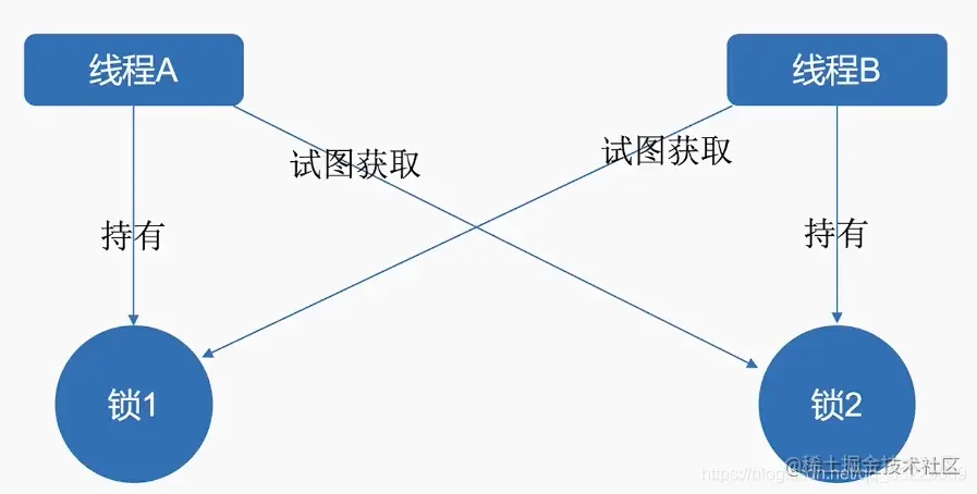 例如下图,线程A持有锁1 ,想去拿锁2, 线程B持有锁2, 想去拿锁1, 但是此时释放都不释放自己的锁, 那么就会进入无尽的阻塞.