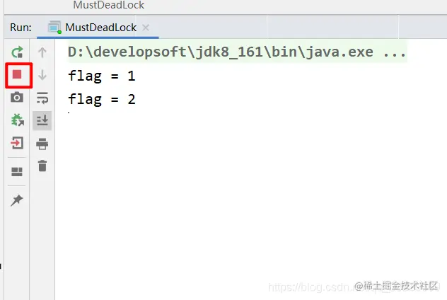 打开控制台, 程序运行如下, 红色的灯一直亮着, 代表程序一直在后台运行中, 并没有结束.此时进入了死锁的状态.