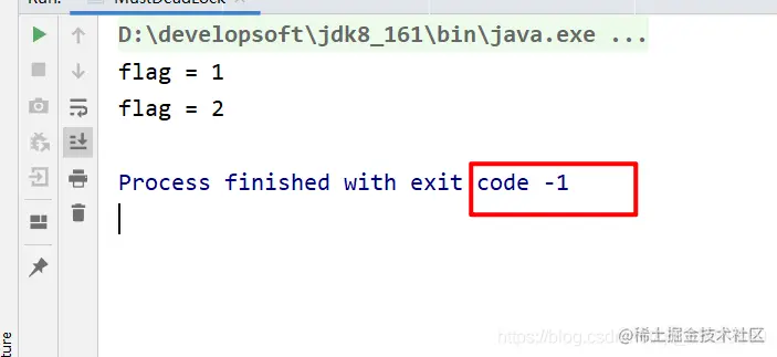 此时如果点击控制台的红色按钮强制退出 可以看到退出码为-1 ,代表为不正常的退出, 应该避免不正常的退出, 否则可能造成数据丢失等情况. 正常退出为0 .