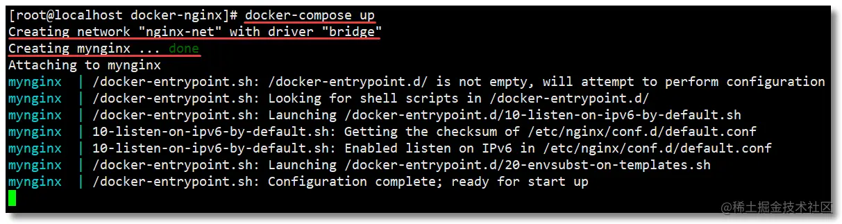 使用 docker-compose up 创建并启动所有服务。这个简单的案例中就只有一个 Nginx 后续我们会来一些复杂的练习: