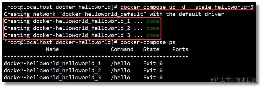 # 通过 --scale 指定 helloworld 服务一次性启动 3 个