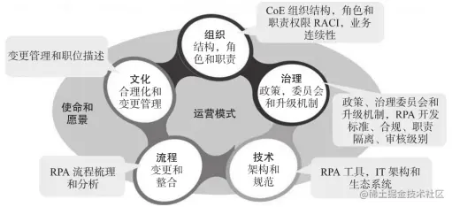 CoE内部的组织结构,包括定义RPA相关角色和职责的RACI图表[RACI代表了谁负责(R=Responsible)、谁批准(A=Accountable)、咨询谁(C=Consulted)、告知谁(I=Informed)这些职责的定义]。明确CoE与业务部门或成员单位之间的责任和权利分配。例如,CoE有权控制机器人的启动或停止,以及修改机器人的执行任务,而双方都有监控机器人运行的权力。