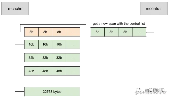 当程序里发生了32kb以下的小块内存申请时,Go会从一个叫做的mcache的本地缓存给程序分配内存。这个本地缓存mcache持有一系列的大小为32kb的内存块,这样的一个内存块里叫做mspan,它是要给程序分配内存时的分配单元。