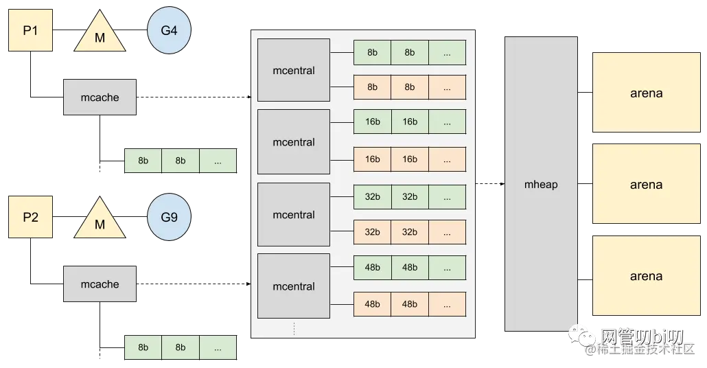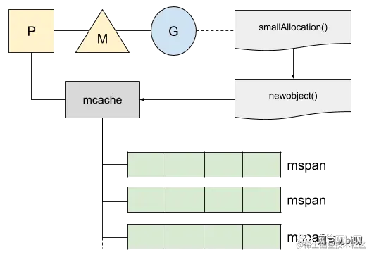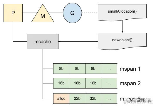 mspan,每种mspan可以分配特定大小的object。 mcache,mcentral,mheap是Go内存管理的三大组件,mcache管理线程在本地缓存的mspan;mcentral管理全局的mspan供所有线程使用;mheap管理Go的所有动态分配内存。- 一般小对象通过