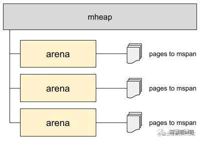 当mcentral没有空闲的mspan时,会向mheap申请。而mheap没有资源时,会向操作系统申请新内存。mheap主要用于大对象的内存分配,以及管理未切割的mspan,用于给mcentral切割成小对象。
