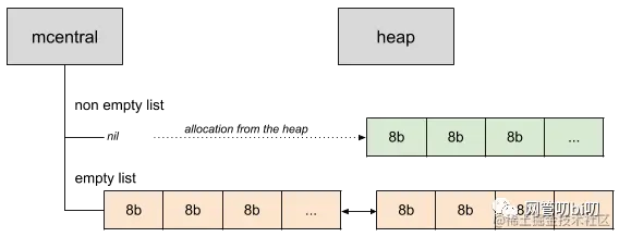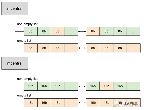 现在,我们可能会好奇,如果分配内存时mcachce里没有空闲的32字节的mspan了该怎么办?Go里还为每种类别的mspan维护着一个mcentral。