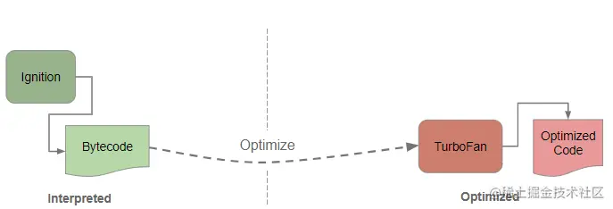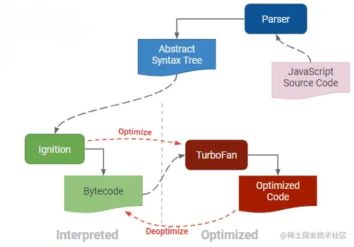 接下来是解释器,它会逐行解释代码,分析 AST 并生成字节码。字节码生成后,AST 会被移除,并且它占据的内存空间会被清空。解释器能够快速生成未优化的字节码,在无延迟的情况下让程序立即开始运行。
