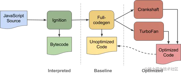 **在 V8 的例子中, 上面那个管线演示图并不是最新的。**下面这个流程图显示的才是当前的管线。请注意,V8 团队始终致力于提升引擎性能,所以这张图不久之后可能也会变化。