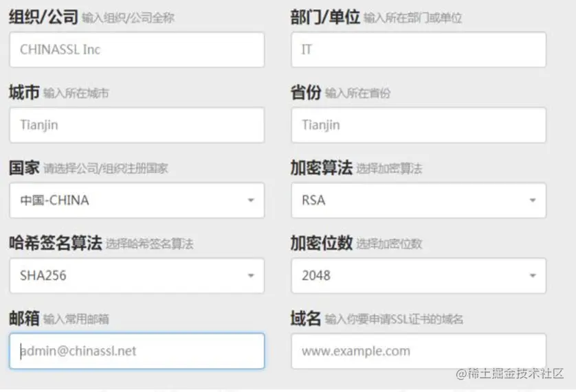 - 服务器上生成 CSR 文件(证书申请文件,内容包括证书公钥、使用的 Hash 签名算法、申请的域名、公司名称、职位等信息)