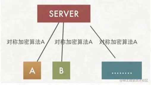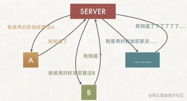 这样就可以保证A/B向服务器端方向发送的消息是安全的。似乎我们通过非对称加密算法解决了密钥的协商的问题?