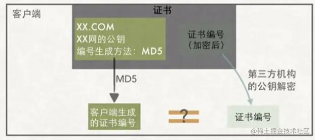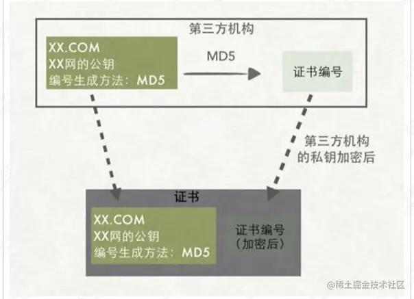 对发送给服务端的数据进行 MD5 算法得到一个 MD5的值,生成证书编号,使用第三方机构 的私钥对这个证书编号进行加密,并且会在证书中添加证书编号的生成算法