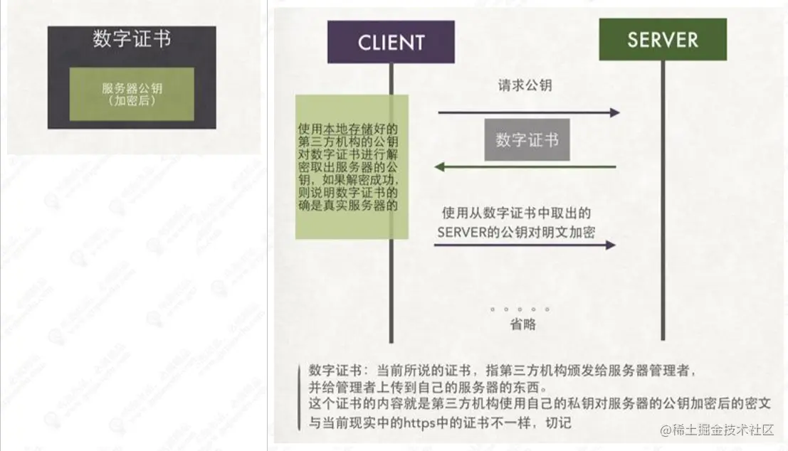 服务端把需要传递给客户端的公钥,通过第三方机构提供的私钥对公钥内容进行加密后,再传递给客户端? 通过第三方机构私钥对服务端公钥加密以后的内容,就是一个简陋版本的 “数字证书”。这个帧数中包含【服务器公钥】