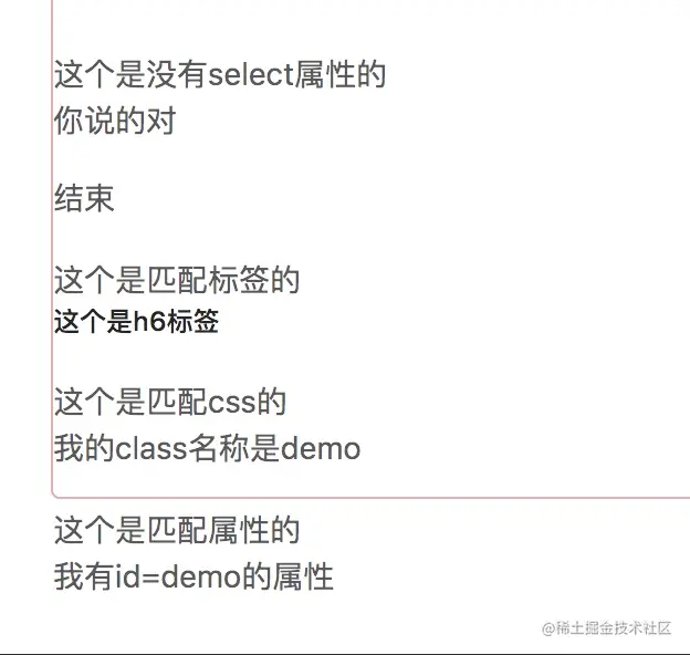 <h6></h6>标签替换了select="h6";<div class="demo">替换了select=".demo";<div id='demo'>替换了select="[id=demo]";我也是刚了解到这个标签,想到的比较好的应用场景:在样式和布局阶段,可以用这种方式实现,这样只需要维护一个样式,其他调用方就不用关注样式修改了~ 下面是自己写的个简单栗子: