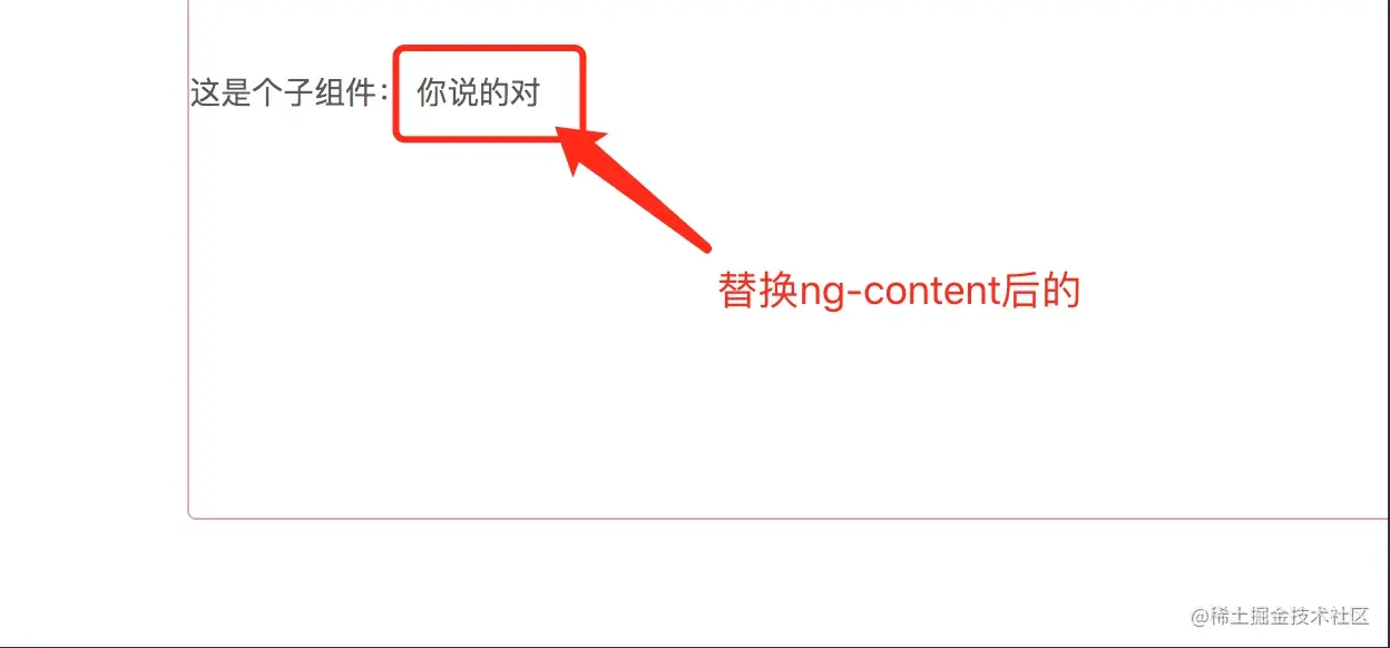 slot有点类似) 当然,这个标签不可能在一个组件里只出现一次,下面看下当一个页面里出现多个ng-content怎么使用。ng-content中有个属性select可以让你在你想要的位置投射。这个属性支持css选择器、标签选择器、属性选择器 来匹配你想要的内容。 ps:如果不设置这个属性,就会接收全部内容。select不支持动态变量。<!-- 这个是含有ng-content 标签的组件 --> <div> <div class="content-item"> 这个是没有select属性的<br /> <ng-content></ng-content> </div> <div class="content-item"> 这个是匹配标签的<br /> <ng-content select="h6"></ng-content> </div> <div class="content-item"> 这个是匹配css的<br /> <ng-content select=".demo"></ng-content> </div> <div class="content-item"> 这个是匹配属性的<br /> <ng-content select="[id=demo]"></ng-content> </div> </div> <!-- 这个是调用方 --> <demo-ng-content> <p>你说的对</p> <h6>这个是h6标签</h6> <div class="demo">我的class名称是demo</div> <div id='demo'>我有id=demo的属性</div> 结束 </demo-ng-content>下面是展示结果,有木有一目了然~ p标签和最后的文字这两块都替换了没有设置select属性的标签;