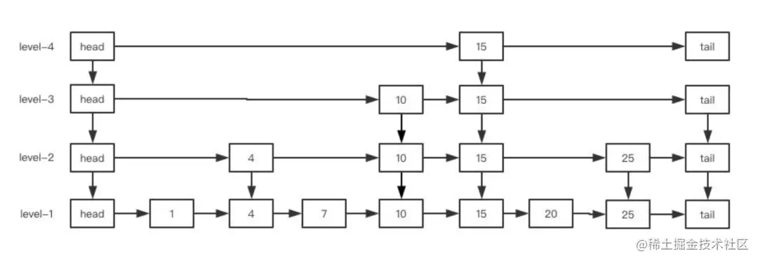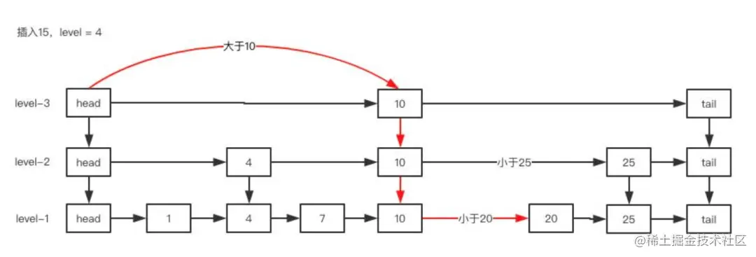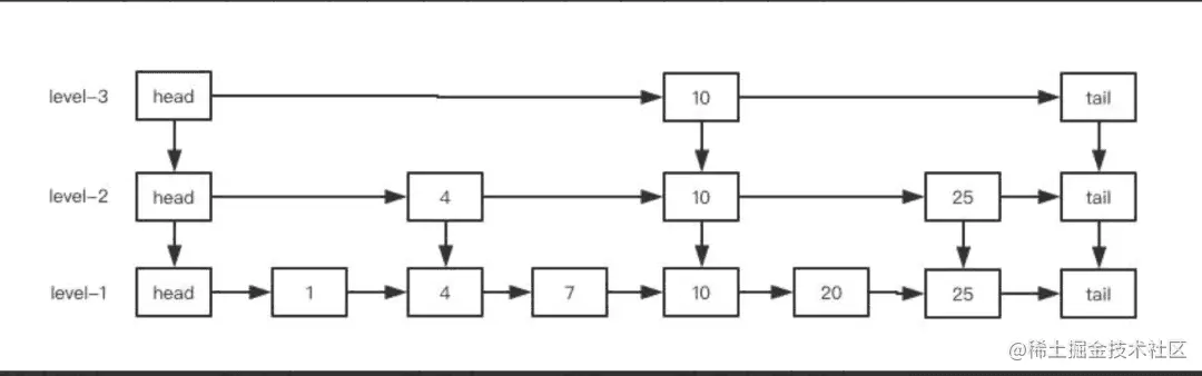 ConcurrentSkipListMap内部使用跳表的数据结构来实现,他的结构很简单。跳表就是一个多层的链表,底层是一个普通的链表,然后逐层减少,通常通过一个简单的算法实现每一层元素是下一层的元素的二分之一,这样当搜索元素时从最顶层开始搜索,可以说是另一种形式的二分查找。在理论上它的查找、插入和删除时间复杂度为log(N)。在并发上,ConcurrentSkipListMap采用无锁的CAS+自旋来控制。也就是说整个插入的过程都是通过CAS来实现的。下面看下一个三层的跳表添加元素的过程: