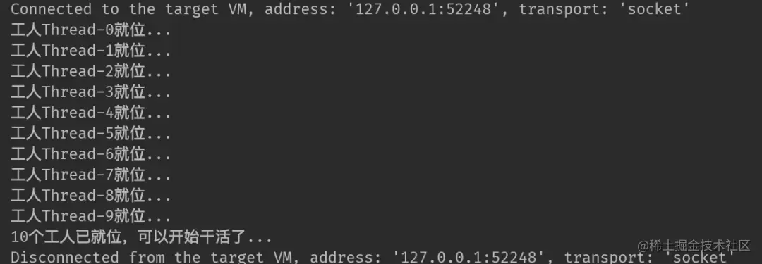 System.out.println(WORKER_COUNT+"个工人已就位,可以开始干活了...");
