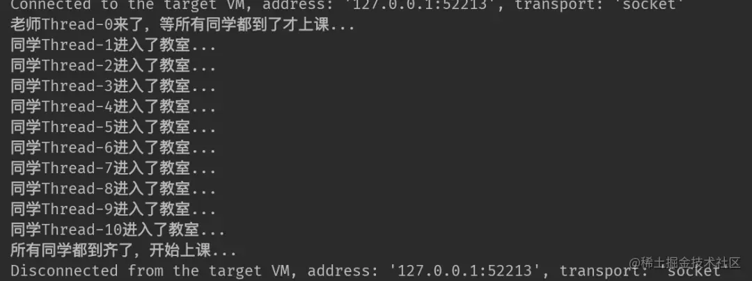 System.out.println("老师"+Thread.currentThread().getName()+"来了,等所有同学都到了才上课...");