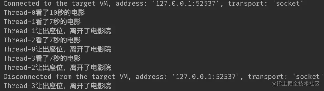 System.out.println(Thread.currentThread().getName()+"让出座位,离开了电影院");
