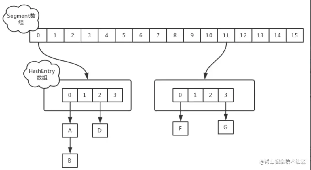 - 这就是所谓的分段锁机制:首先将数据分成一段段存储,每一段叫一个Segment,然后给每段数据配一把锁,叫Segment锁。当一个线程想要访问某段Segment的数据,它需要获得锁,然而其他段的数据还能被其他线程访问,这在一定程度上降低了锁粒度。