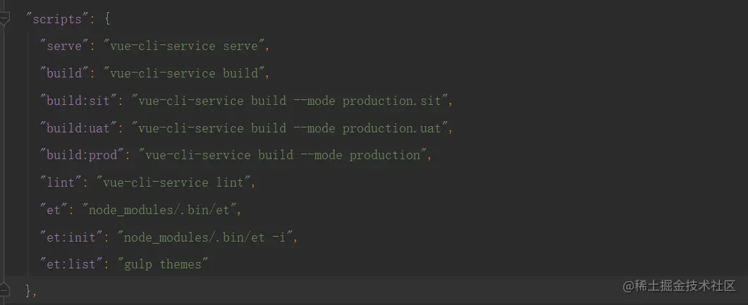 我们的前端项目使用vue开发,在前端项目的package.json文件中,一般都会定义用于打包的脚本