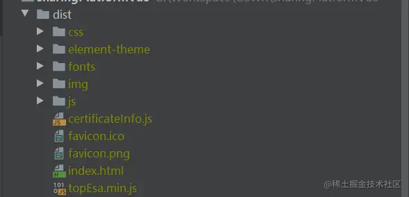 当我们打包完成之后,会在我们项目目录下出现dist目录,里面存放的就是我们打包出来的文件