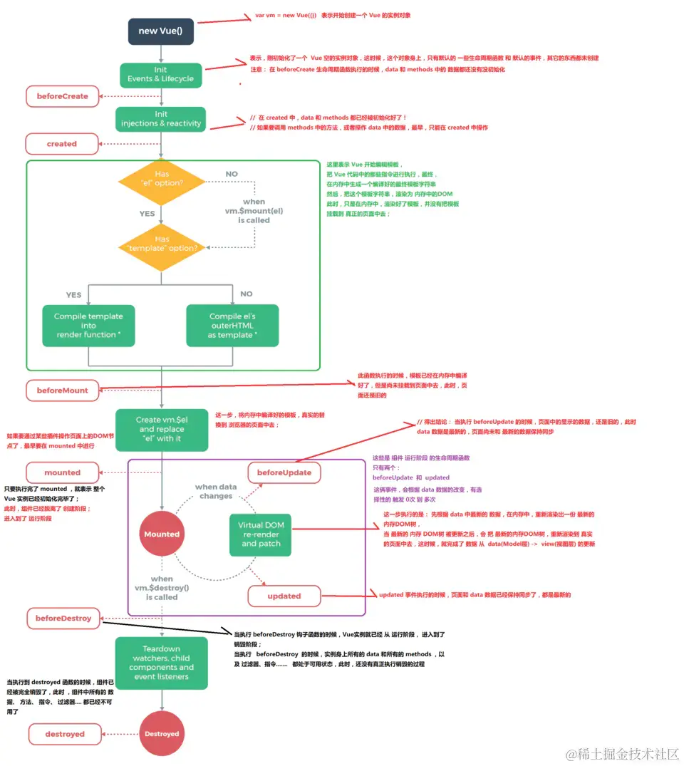 - created:在模板渲染成html前调用,即通常初始化某些属性值,然后再渲染成视图。 mounted:在模板渲染成html后调用,通常是初始化页面完成后,再对html的dom节点进行一些需要的操作。如果在mounted钩子函数中请求数据可能导致页面闪屏问题。