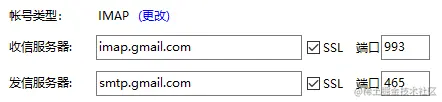 | SMTP | smtp.gmail.com | SSL | 465 | 发信 |