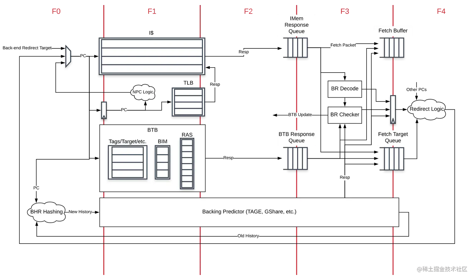 BOOM的Front-end前端部件在获取指令同时,在整个获取阶段对指令进行预测,以在多个获取周期(F0、F1、F2..)中重新定向指令流。如果在BOOM的Back-end(执行流水线)检测到预测失误,或者BOOM的一个预测器希望将流水线重定向到另一个方向,一个请求就会被发送给前端部件,它会开始向着一条新的指令路径进行取指。如果希望了解更多关于分支预测是如何在指令预取阶段工作的,可以查看 分支预测 那节的内容。