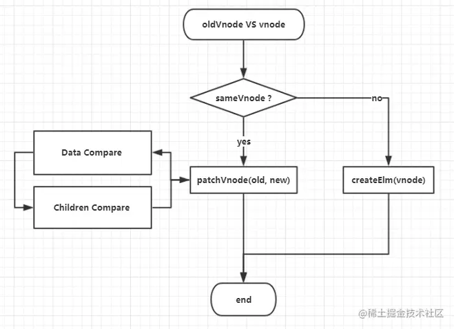 虚拟dom的比较,就是找出新节点(vnode)和旧节点(oldVnode)之间的差异,然后对差异进行打补丁(patch)。大致流程如下: