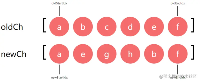 图中的oldCh和newCh分别表示新旧子节点数组,它们都有自己的头尾指针oldStartIdx,oldEndIdx,newStartIdx,newEndIdx,数组里面存储的是vnode,为了容易理解就用a,b,c,d等代替,它们表示不同类型标签(div,span,p)的vnode对象。