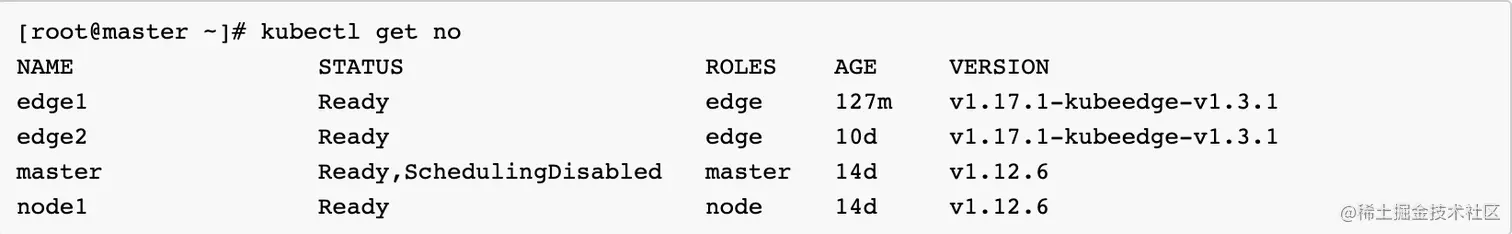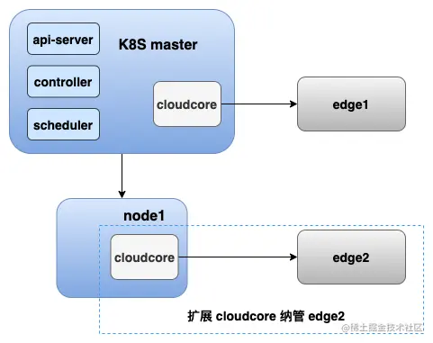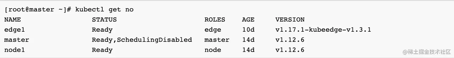 测试集群单 master 节点,管理一个 node1 工作节点,cloudcore 运行在 maser 节点上,并已接入 edge1 边缘节点。