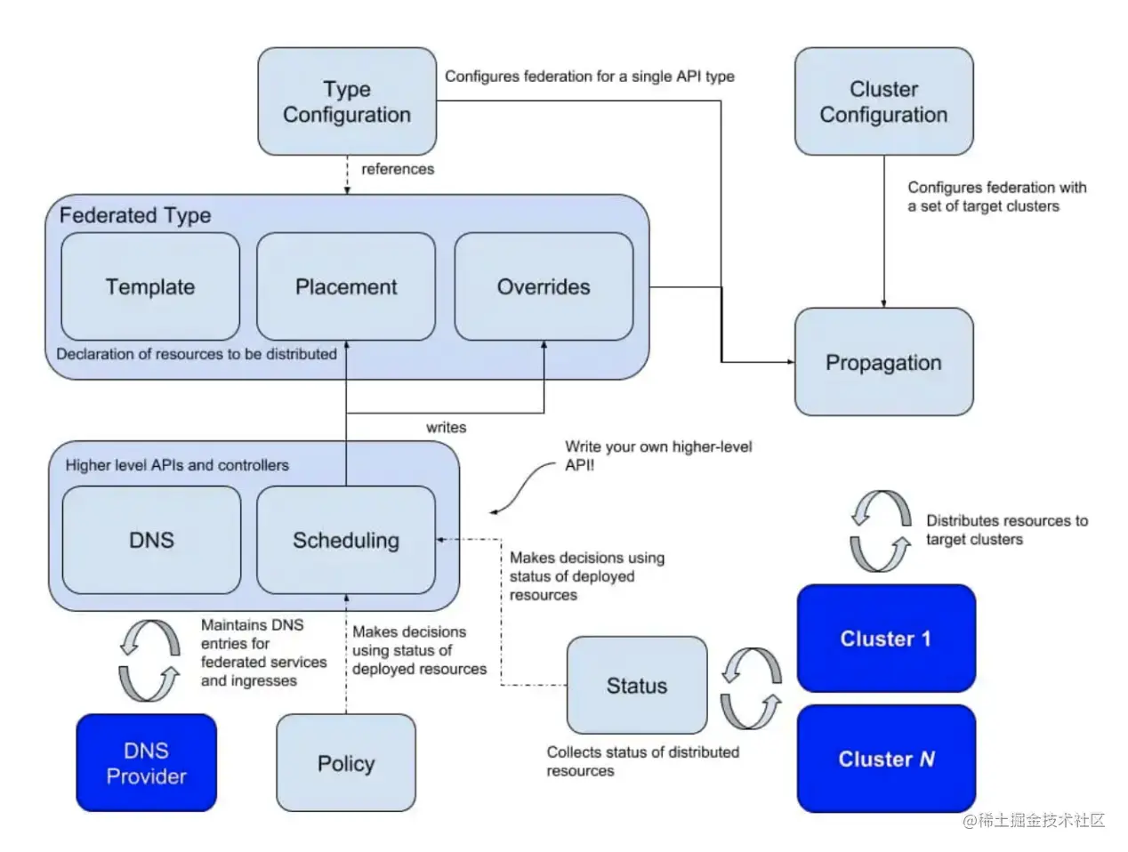 由架构图实现可以看出,Federation V2 在 k8s 之上定义了一些资源,用 cluster configuration 记录集群的 endpoint,secret 等认证信息,type configuration 来定义需要用 Federation 托管的资源类型,提供了调度器来平衡各个集群的负载,以及多集群的 DNS 功能。