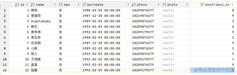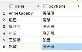 目的: 查询两张表的字段每个女神对应的男朋友的名字, 比如周芷若的男朋友张无忌.