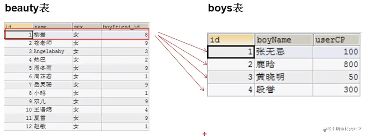 - 需要加上条件避免, 比如beauty表的boyfriend_id = boys表的id