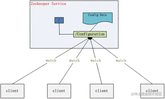- 应用中用到的一些配置信息集中管理,在应用启动的时候主动来获取一次,并且在节点上注册一个watcher,以后每次配置有更新,实时通知到应用,获取最新配置信息。