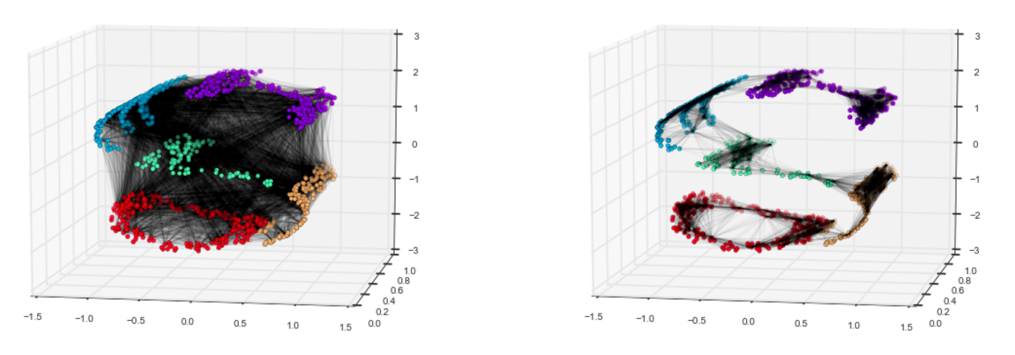 通过研究分解这个螺旋状数据集之间的不同方法,可以很好地理解这个想法。左侧是一种更像PCA的方法,用于保存数据的形状,其中每个点彼此连接。然而,右边是一种只计算数据点邻域之间的距离的方法。