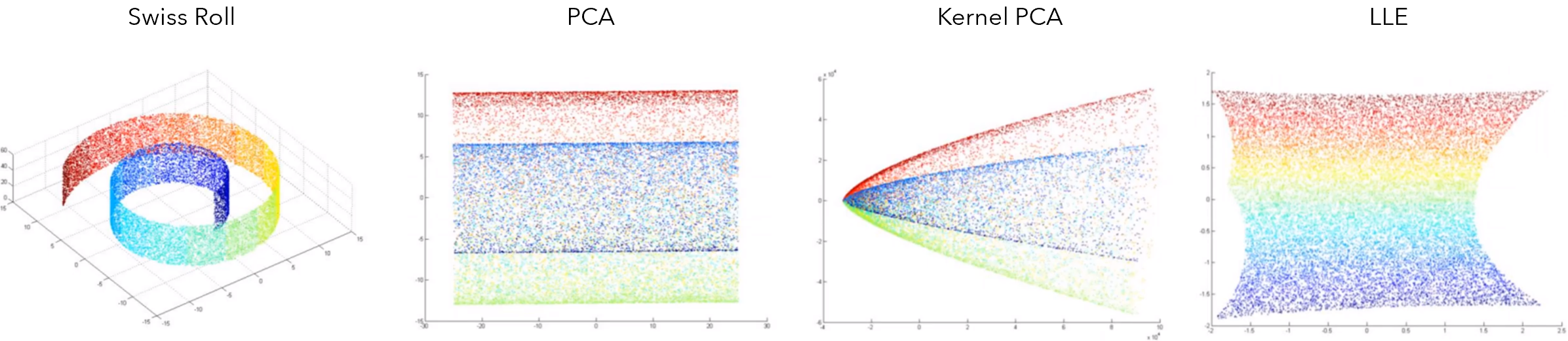 在瑞士Roll数据集上,PCA甚至像Kernel-PCA这样的特殊变体都无法捕捉值的梯度。另一方面,流形学习算法局部线性嵌入(LLE)也能够做到。